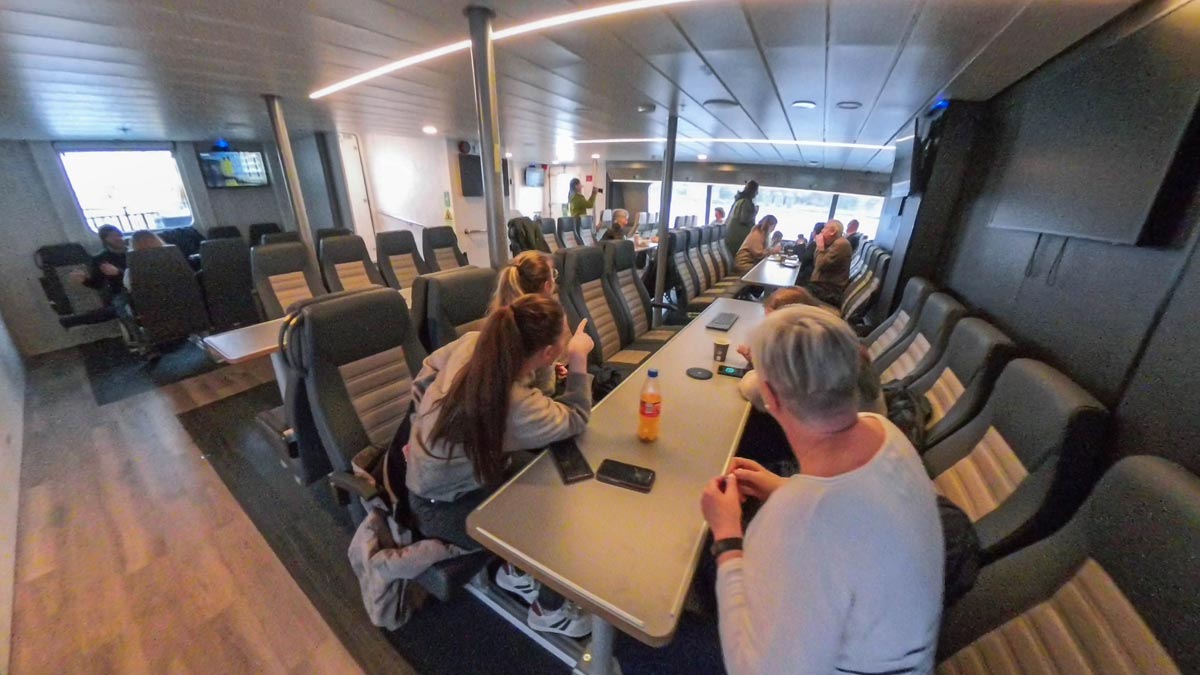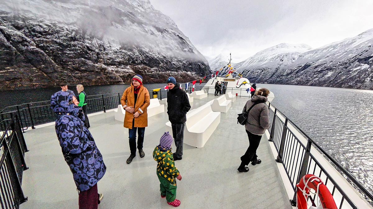 - On the open upper deck, surrounded by towering cliffs, waterfalls, and raw Nordic wilderness